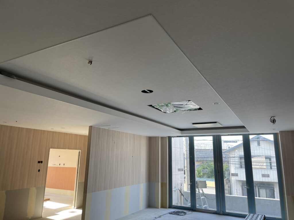 ボードが上手く貼れていないと、次の工程であるクロス工事の仕上がりに大きな影響が出てしまいますので、へこみや隙間なく平らになるよう熟練の職人が施工します。